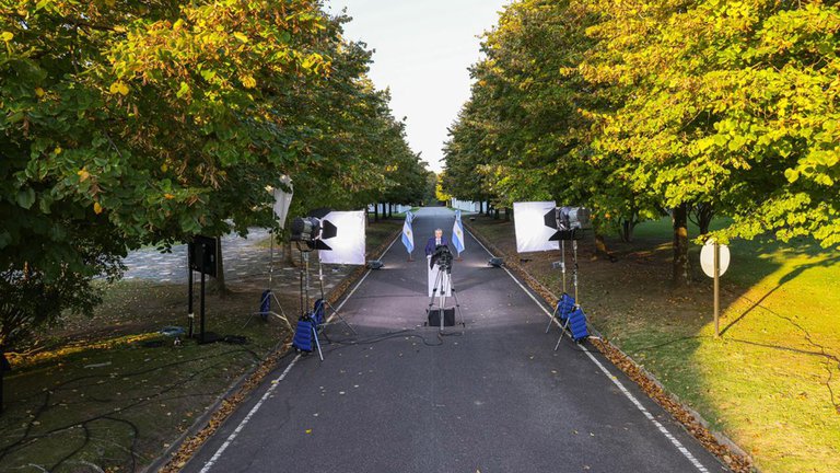 Según explicaron fuentes oficiales, el set de grabación fue armado varias horas antes de la llegada del Presidente. Todas las personas que trabajaron en la instalación de la iluminación y el sonido se retiraron antes de su llegada. “Todos utilizaron equipos de protección personal, barbijos y máscaras protectoras”, indicaron.